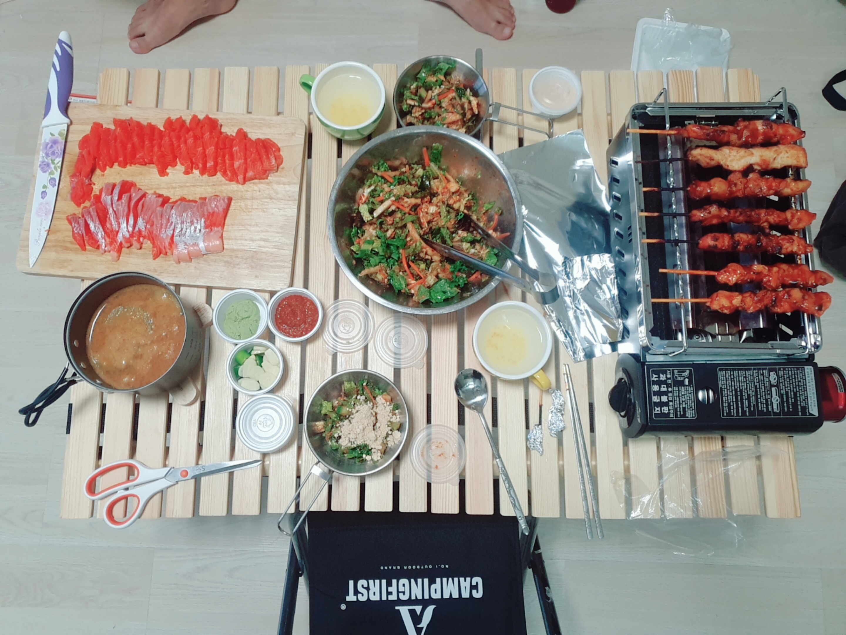 캠핑을 못가니 이런식으로라도 기분을 내는데 송어회랑 구이바다에 닭꼬치 올려두니 제법 그럴듯하다